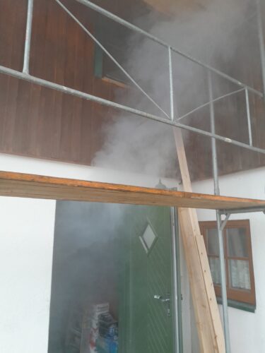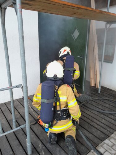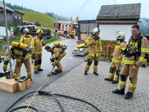 Nach eintreffen des Übungsleiters an der Übungsadresse, ließ dieser sofort einen Atemschutztrupp zur Personenrettung und Brandbekämpfung ausrüsten. Zeitgleich wurde ein C-Hohlstrahlrohr zur Brandbekämpfung in Betrieb genommen. Die Mannschaft des Löschfahrzeuges baute die Saugstelle bei der Wasserentnahmestelle bei der Pumpanlage der Russbacher Hornbahnen auf und verlegte die Zubringerleitung zum Rüstlöschfahrzeug. Der Atemschutzrettungstrupp wurde durch die Mannschaft des Löschfahrzeuges gestellt. Nach der endrauchung des Gebäudes mit dem Lüfter konnte Wasserhalt gegeben werden und die Übungsstelle zusammen geräumt werden. Nach dem Zusammenräumen und herstellen der Einsatzbereitschaft wurde noch eine Nachbesprechung abgehalten, um auf eventuelle Gefahren aufmerksam zu machen.